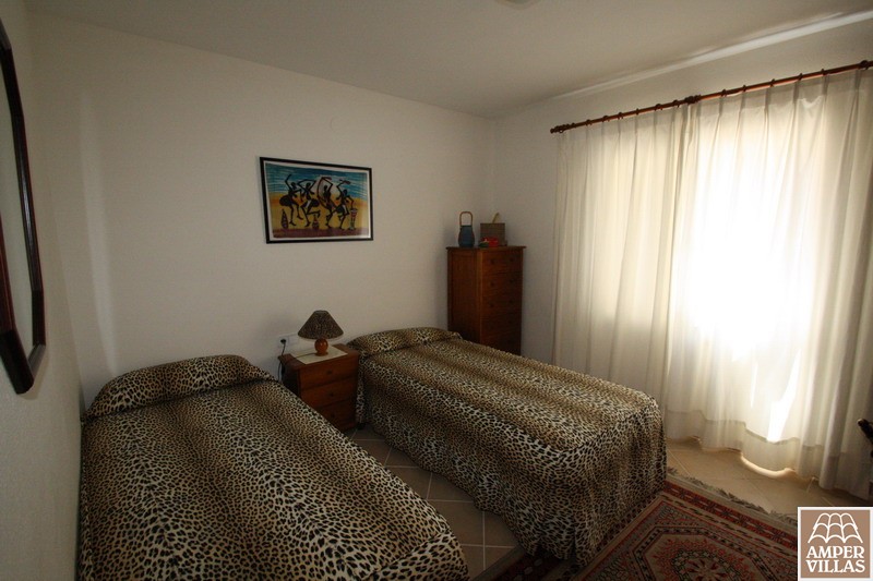 On the first floor: living room with exit to the pool, open plan kitchen, 2 bedrooms, bathroom with shower, fans in the bedrooms.